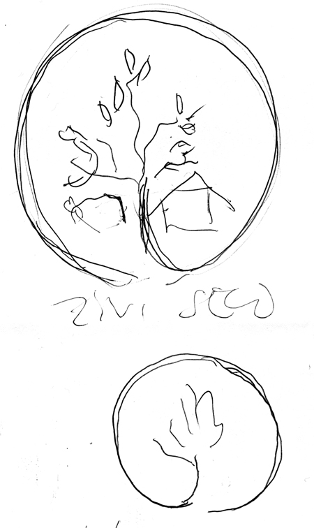 Taj savinuti rub daje znaku formu pečata, jednostavnost i čistoću. Asocira na kineski pečat. Nekada su kolekcionari slika u Kini na djela od posebne vrijednosti utiskivali svoj pečat. Osim što je to bio znak vlasništva nad djelom, više od toga, on je bio znak uvažavanja i priznanja njegove izuzetne vrijednosti. Iz toga se logično rodila ideja da se taj znak, osim što je simbol cijeloga projekta, stavlja uz radove koji pridonose razvoju projekta Živi selo.